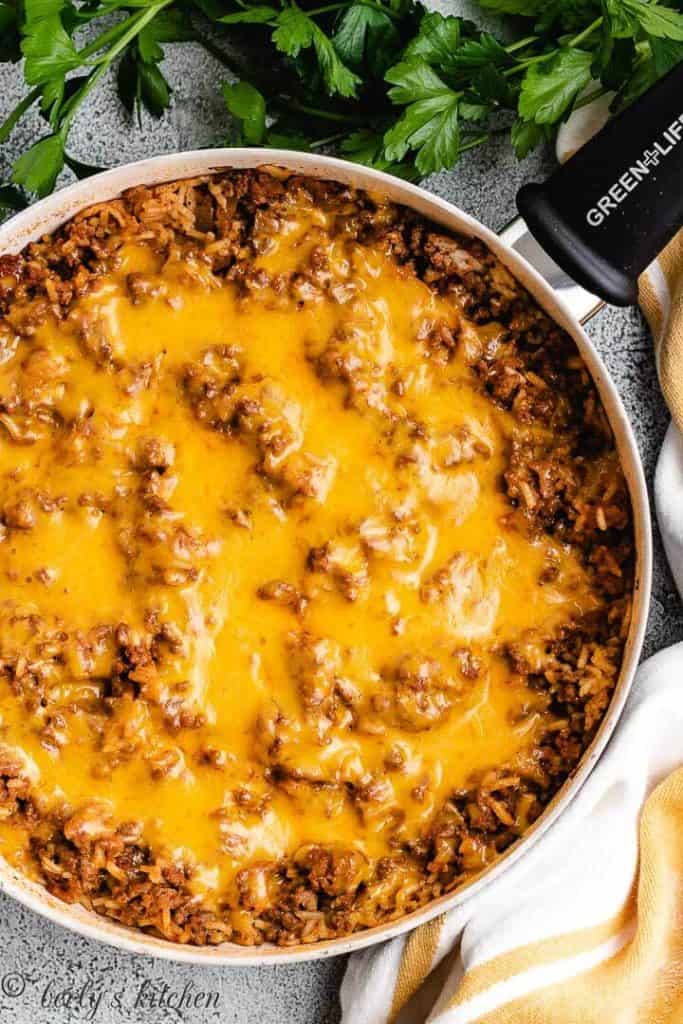 Our hamburger rice casserole features seasoned ground beef, long grain white rice, melted cheddar cheese all made in one pan.