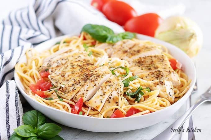 But, after a few months of heavy dinners, I could go for some lighter fare. Keeping that theme in mind, Kim and I decided to publish our bruschetta chicken pasta.